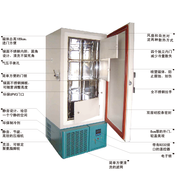 "天寒"-86℃超低溫冰箱采用德G進口復疊式超低溫制冷壓縮機組、G際知名品牌零部件生產(chǎn),性能穩(wěn)定,運行可靠。不銹鋼內(nèi)膽、雙層保溫、外型美觀、噪音比進口品牌低、能耗比進口品牌少、經(jīng)濟實用。通過采用風扇和自然對流兩種散熱方式,機器適應高溫及臟亂環(huán)境的能力大大加強,以較強的性價比優(yōu)勢逐漸贏得了G內(nèi)、G際市場的認可。產(chǎn)品被廣泛應用于生物制品、化學試劑、血漿、疫苗、菌種、生物樣本等低溫保存。