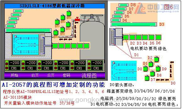 在人機(jī)界面實(shí)時(shí)監(jiān)控多臺SZDJLSLX-4186型超低溫深冷箱,在觸摸屏流程圖上實(shí)時(shí)監(jiān)控運(yùn)行狀態(tài),群控低溫深冷箱,用開關(guān)量輸入模塊AI-3011D5M模塊來實(shí)現(xiàn)低溫深冷箱運(yùn)行狀態(tài)的反應(yīng)。