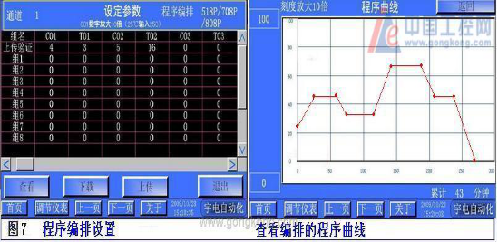 對于518P、708P、808P程序參數(shù)設(shè)置,點(diǎn)擊【A】框,進(jìn)入【手/自動、編程設(shè)置控制平臺】;圖5所示的編程界面:出現(xiàn)【通道一程序編排設(shè)置】;程序編排平臺用組別配方來設(shè)置程序段【C01】和【T01】表示,以【組1】為例:點(diǎn)擊選中【組1】點(diǎn)擊組名【C01】下面的數(shù)據(jù)框輸入溫度值【250】(注:在溫度欄C01輸入的數(shù)值要放大10倍如25℃輸入的數(shù)據(jù)是【250】放大10倍);點(diǎn)擊組名T01下的時(shí)間段寫入實(shí)際時(shí)間值分鐘如15分鐘寫入【15】;設(shè)置好程序配方選中配方組如:【組1】在菜單條中點(diǎn)擊【查看】可看到已編排的曲線圖形;點(diǎn)擊【返回】;選中編輯好的配方組【組1】點(diǎn)擊【下載】操作,已編排的程序就下傳給程序儀表;即時(shí)可操作【運(yùn)行】【停止】【暫停】【手動】【自動】【返回】。采用【上傳驗(yàn)證】儀表中的程序曲線來檢驗(yàn)程序是否下傳,程序配方可保存15組程序在觸摸屏中。圖7